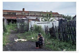 2017年7月,七台河市茄子河区富强矿附近,一位老太太坐在公房前照看鸭子打发时间。七台河开展采矿区的棚户区搬迁已经多年,大部分地区的棚户区拆除完毕,少部分仍然居住的居民在开春后能通过种植些玉米蔬菜,或者养养鸡鸭去改善生活。