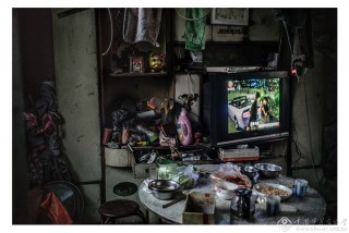 一位失业矿工的家,桌面摆放着简单的食物、杂物到处堆积,电视中播放的韩剧成为他们生活的调剂。
