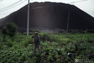 2017年七台河市茄子河区,一位从矿上退休的大姐在护理家旁边的菜地,身后是巨大的煤泥山。