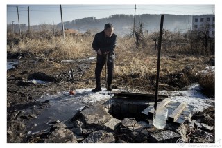 2016年3月,鸡西市滴道区,退休矿工张庆吉经常从家里走到矿工聚居区前的井口观察水质。张庆吉说起矿区现状,总结道:“煤黑子完蛋了。” 矿工在井下工作经常满脸乌黑,则被人蔑称为煤黑子。自来水管入冬后被冻住,一直无人修理,居民们只好靠井水维持生活。当地居民判断井水的水质,只能从沉淀物多少来揣测。