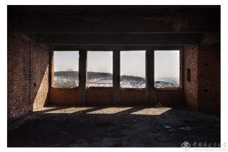 2016年3月,鸡西市大同矿,从一栋废弃的建筑往外望去是被雪覆盖的山丘,半山上有搭建的矿工公房,它们与这栋烂尾的建筑一样,不再被人使用。这栋烂尾楼曾经被规划为医院,但是附近的煤矿开采成本太高,塌陷区也无法准确测算,而被企业所放弃。