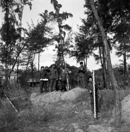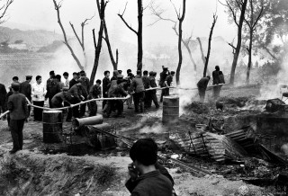 竹叶搭建的军营被一场大火烧毁 。1982年。