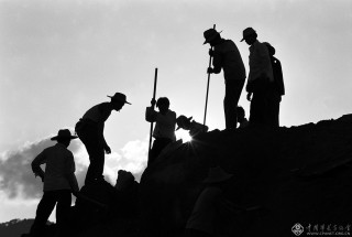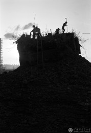 1982年,战士们迎着朝霞开山平地,为建设新城、铺平道路。