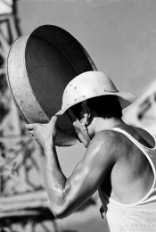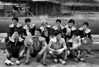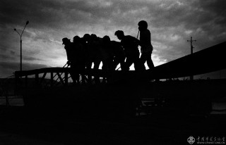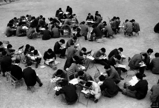 《职工考场》,1984年,刚刚脱下军装的基建工程兵战士,在操场上进行军转工的技术晋级考试。