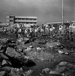 1981年,为改变深圳对外脏乱差的形象,部队先后承担了深圳火车站广场、市工人文化宫广场、深圳老街排污沟等改建工程。图为部队官兵在工人文化宫门前清污施工。