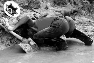 面对艰苦环境,官兵们发扬军队艰苦奋斗的精神,荒山扎营,挖土坑做饭,大水井边上冲凉。