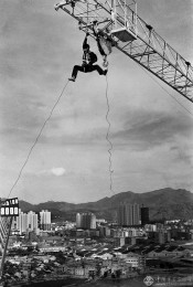 1983年,部队在红岭大厦施工中,因二台吊车缆绳绞在一起,一位战士吊在空中及时排出了险情。