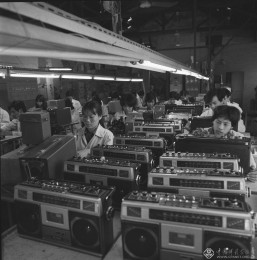 东莞道滘电子厂工人在精心装配收录音机。邓大端拍摄于1983年-1984年