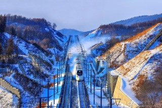 2017年1月15日,一辆高铁行驶在吉林省长珲城际铁路北茨沟。刘慎库摄
