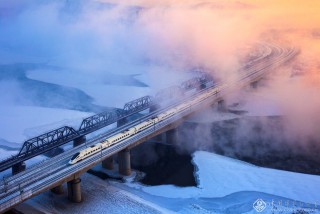 2016年1月21日,一辆高铁飞驰在极寒地区的吉林松花江高铁特大桥上。刘慎库摄