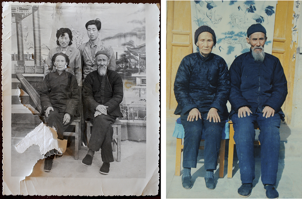 左图:2013年2月,爷爷、奶奶的房子内景,墙上挂着他们的老像,那时爷爷已去世,奶奶生病卧床不起。