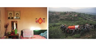 右图:2013年7月,奶奶去世,众乡亲们抬着精致艳丽披着大红喜字绸缎的棺木。在我们村,老人能活到90多岁去世也算“白喜事”。
