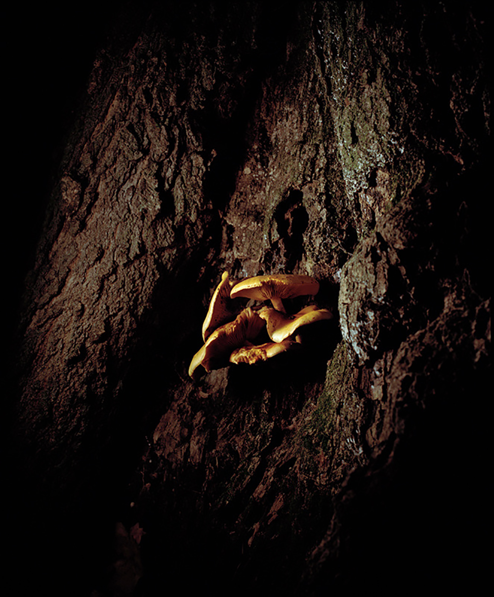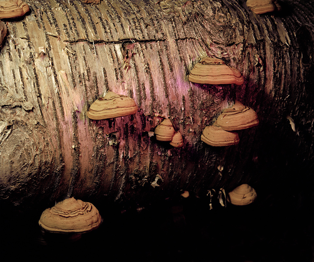 在《双重特征》专题中,我结合同时在做的两个项目展现了这一理念。其一是我记录了一家自己从小到大经常光顾的影院。当地纸媒宣布这家影院即将被拆掉,取而代之的是一家拥有更先进技术的大型影院。其二是我晚上在父母家后面的树林里拍摄蘑菇画像。旧的被分解了,新的蘑菇一夜之间破土而出。并且希望通过夜晚的记录,展现蘑菇仙子般的气质。在这一理念下,我将这两项专题结合起来,希望引起人们对于人工环境和自然环境中事物的腐朽与变革重新进行思考。