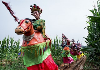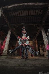 《叠罗汉》照片拍摄于江西南丰上甘村,上甘村是中国“傩舞艺术之乡”,每年正月表演傩舞。从初一上午开始“起傩”,到正月十八晚上在傩神殿“解傩”。此片是“解傩”当晚九个节目其中之一《演罗汉》的技巧舞,表现的是大肚罗汉虔诚礼佛和摔八罗汉一同练武的情景。陈文明摄