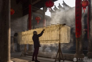 《马头墙下》文字说明:此照片2017年12月24日摄于浙江省浦江县潘周家村。古宅、马头墙、灯笼、对联,一农妇正在晾晒用传统手工制作的挂面,在阳光的照射下充满生机。《马头墙下》李校荣 摄