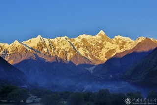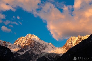 《日照神山》蓝天、白云、阳光,贡嘎山金光灿烂。2013年2月14日拍摄于川西海螺沟。李浩摄。