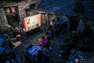 2018.11.2日摄于山东台儿庄山亭邢山顶村的石板房农家院内。皮影戏是当地非物质文化遗产项目。老艺人深入乡村、农家表演皮影戏,深受群众欢迎。赵永泉 摄