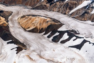 冰川汇合。陈剑峰 摄影 甘肃省肃北蒙古族自治县,野马山主峰大雪山。拍摄时间:2018年8月7日12:50。拍摄位置:北纬39.3475,东经96_.5761;敦煌至西宁的民航飞机上。