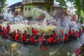 每年农历五月初八村民划龙舟来拜祭龙母。两村龙舟相遇,传统习俗就是龙舟上的人互相泼水,泼得越热烈,越显得关系好。《老表相见、以水相迎》周宗毅 摄