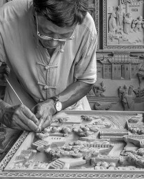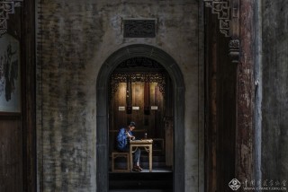 拍摄于2017年6月29日,安徽黄山呈坎景区,正在进行创作的是张红贵师傅,他是国家级雕刻大师洪建华(徽派博物馆馆长)的徒弟,待人宽厚,平易近人,为我的创作提供了保证,我不断地变换场景和视角,后期大胆裁剪,突出徽派室内建筑特色,凸显张红贵师傅聚精会神的进行竹筒雕刻创作。竹雕 李朝晖 摄