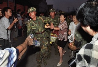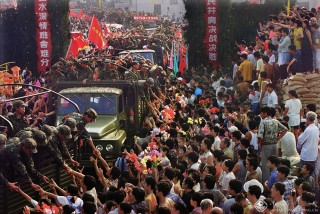 26、 九江城哭了---1998年9月15日,九江市民倾城出动与抗洪救灾部队惜别。于文国摄._