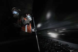 35、 隧道工--2010年8月19日,我国第一条亿吨运煤专线大秦铁路燕山隧道内,运煤列车通过时的护路工人。于文国摄