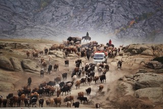 哈萨克牧民秋季转场——2018年9月24日,新疆阿勒泰,转场的牧民们已经使用上了汽车和摩托车。一部小货车载着老人孩子和日常生活用品,时而跟随着牧民的迁徙队伍,时而穿行在广袤原野上。