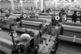 37年过去了,岜山村办工业从无到有,从小到大,建成了厂房密布、高楼林立、功能完善、环境优雅的现代化工业小城镇,工业产值过50亿元。图为岜山织造有限公司生产线。