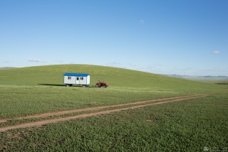 白嘎利《家在草原》30—03牧民开拖拉机拉着房车去转场。内蒙古东乌旗商都嘎查,2015年8月。