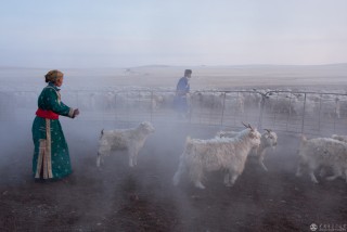 白嘎利《家在草原》30—04草原冬天的早晨,牧民夫妇准备放出羊群。内蒙古东乌旗呼日其格嘎查,2014年12月。