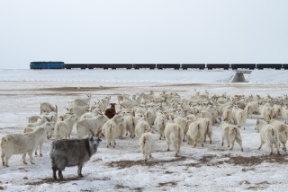 白嘎利《家在草原》30—06火车驶过宁静的冬季草原。内蒙古东乌旗哈拉盖图嘎查,2011年2月。