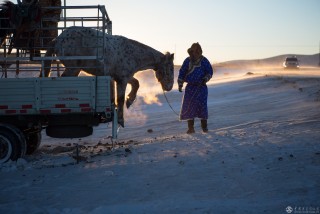 白嘎利《家在草原》30—09牧马人开着汽车拉着赛马从远处赶来参加冰雪那达慕。内蒙古西乌旗吉仁高勒镇,2013年1月。
