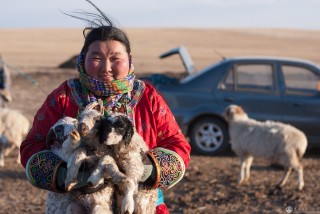 白嘎利《家在草原》30—15草原春天下羊羔,牧人朝鲁门家接羔成活率高,妻子额尔敦其其格高兴。内蒙古东乌旗白音敖包嘎查,2010年4月。