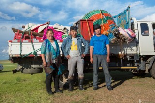 白嘎利《家在草原》30—19.汽车上装好蒙古包,准备去转场的牧人特古斯、妻子乌云娜和儿子巴雅尔。内蒙古东乌旗达布希拉图嘎查,2013年6月。_