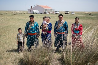 白嘎利《家在草原》30—20.牧民额尔敦陶格涛全家(母亲、妻子、两个孩子、弟弟)在自己的草场合影,背景是定居的砖瓦结构房。内蒙古东乌旗巴音淖尔嘎查,2013年5月。_