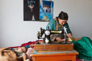 白嘎利《家在草原》30—25.额尔敦陶格涛的母亲在家缝蒙古袍,孙女在熟睡。内蒙古东乌旗陶森淖尔嘎查,2010年5月。_