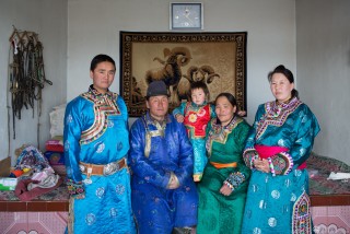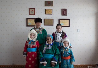 白嘎利《家在草原》30—29.牧人额尔敦苏和与老伴,儿子儿媳和孙女合影。内蒙古东乌旗杜兰嘎查,2012年4月。_