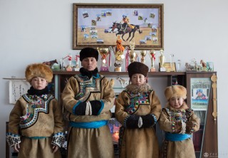 白嘎利《家在草原》30—26.牧人朝克与母亲、妻子和两个孩子在家合影,墙上挂的是“星级文明小康户”、“先进个人”等奖牌。内蒙古东乌旗满都宝拉格嘎查,2013年2月。_