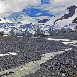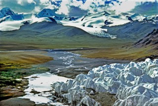 大江之源 唐古拉山各拉丹东雪峰下的姜根迪如冰川,远处可见冰川消融形成的辫状小溪,长江就从这里的涓涓细流开始了她的万里行程。(拍摄于1976年8月25日)