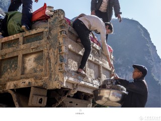 22.2019年1月29日,搬迁进城的时间到了,村民们天不亮就徒步出发去村上,从组上到村上走路需要2个半小时的土路。图为天亮后乡里专门安排人员来到组上将几名有残疾的村民用越野车拉到村上集中的地方。_