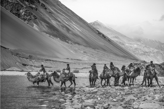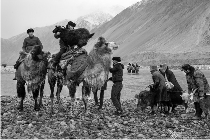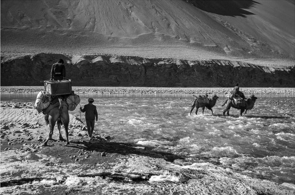 13_驼队渡过冰冷的河流,冰冷的河水对人畜都是严峻的考验 。