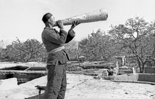 1951年,青海,农民宣传员用自制的纸话筒向群众宣传土改政策。 茹遂初摄于民和县川口区