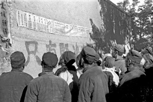 1951年,青海,划分阶级成分,坚持三榜定案,图为青海民和县川口区王家户村群众在观看第一榜。 茹遂初摄