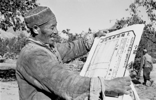 1951年,青海,民和县磨沟村回族僱农冶金财在土改中分得水地二亩五分,冶金财喜看颁发的土地证。 茹遂初摄