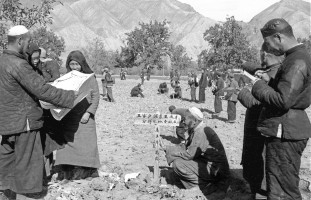 1951年,青海,民和县川口区王家户村的回、汉农民在已分好的土地上挿地标,这块地是分给回族雇农王成才的。茹遂初摄
