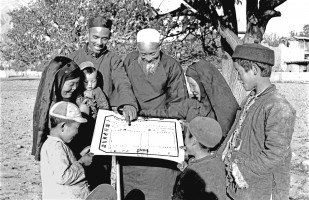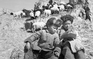 1951年,青海,土改后开展了冬学识字活动,图为两牧童在复习昨晚学的生字。 茹遂初摄于民和县