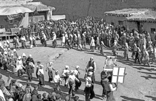 1951年,青海,回、土、藏各族人民扭着秧歌欢庆自已的翻身。 茹遂初摄于民和县