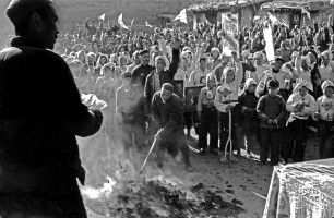 1951年,青海, 民和县一区二乡在庆祝土改胜利大会上烧毁地主阶级掠夺农民的地契、文书。茹遂初摄