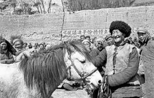 1952年,青海,湟中县上五庄回族农民马生苍分到一匹大白马,他抚着马鬃高兴的说:分到土地又分到牲畜,这一下劳动生产有了本钱。茹遂初 摄
