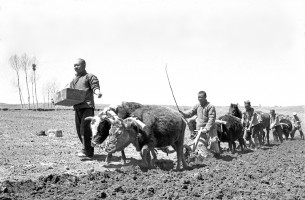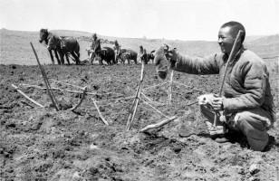 1952年,青海湟中县上五庄的一个变工组在播种。土改后农民在政府和农会的领导和帮助下,自愿组织起来发展生产。 茹遂初摄